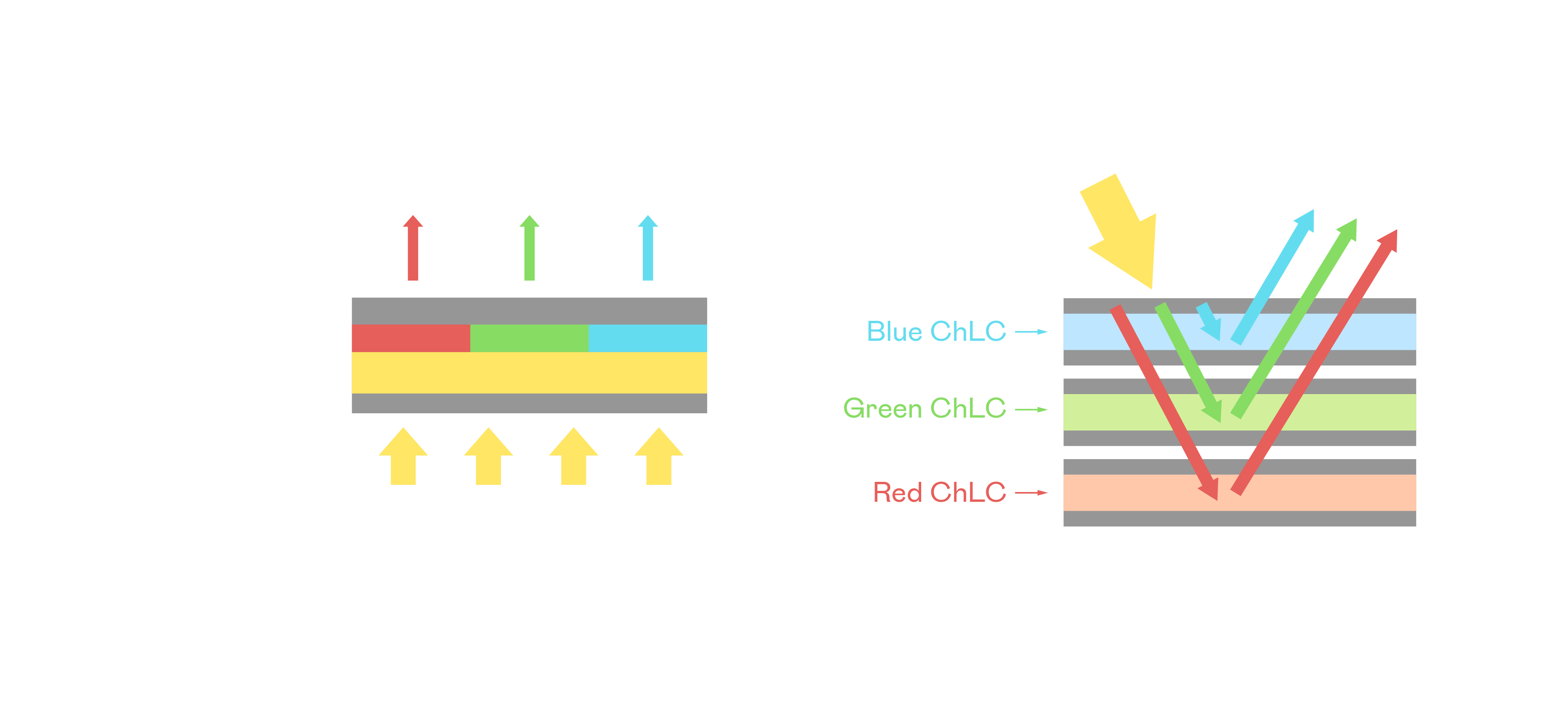 AG公司胆固醇液晶显示器是由红、绿、蓝三层胆固醇液晶面板堆叠而成,并采用无彩色滤光片设计,减少环境光在反射过程中的损耗。