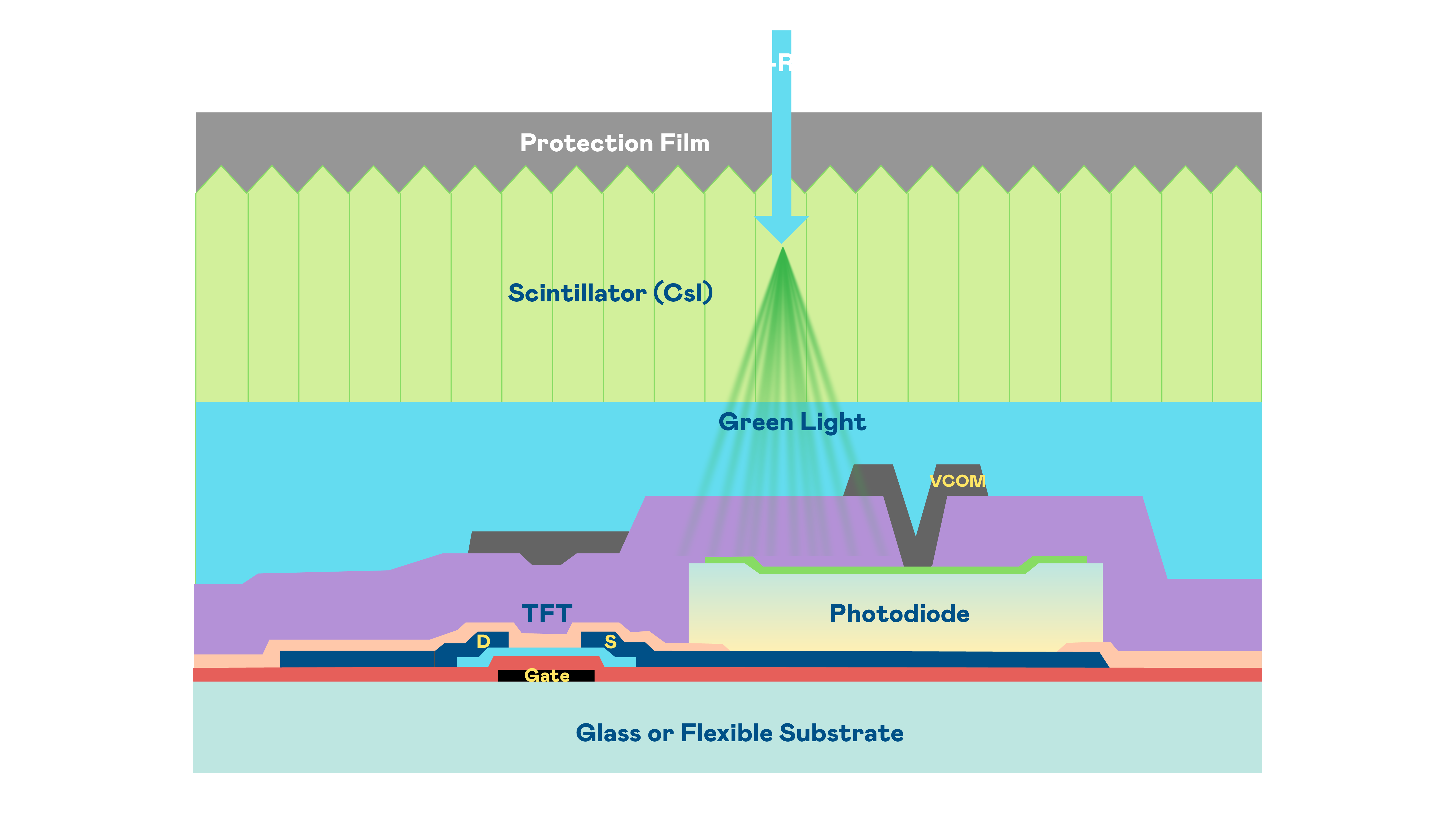 AG公司的X光影像感测阵列使用薄膜电晶体 (TFT) 作为每个像素的读取开关,搭配光电二极体(Photodiode)的光电转换元件,用以感测X光影像讯号。